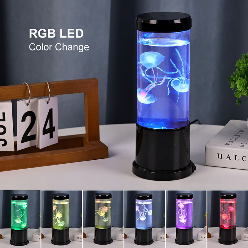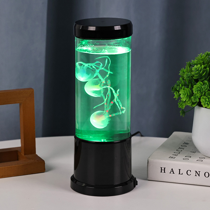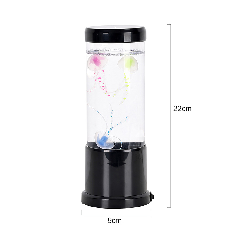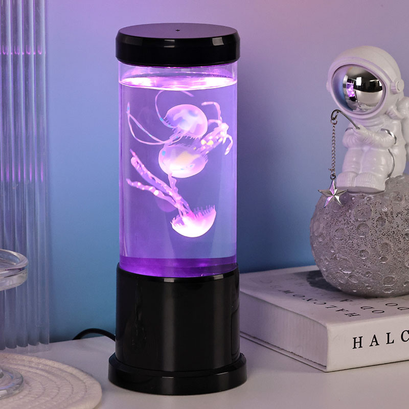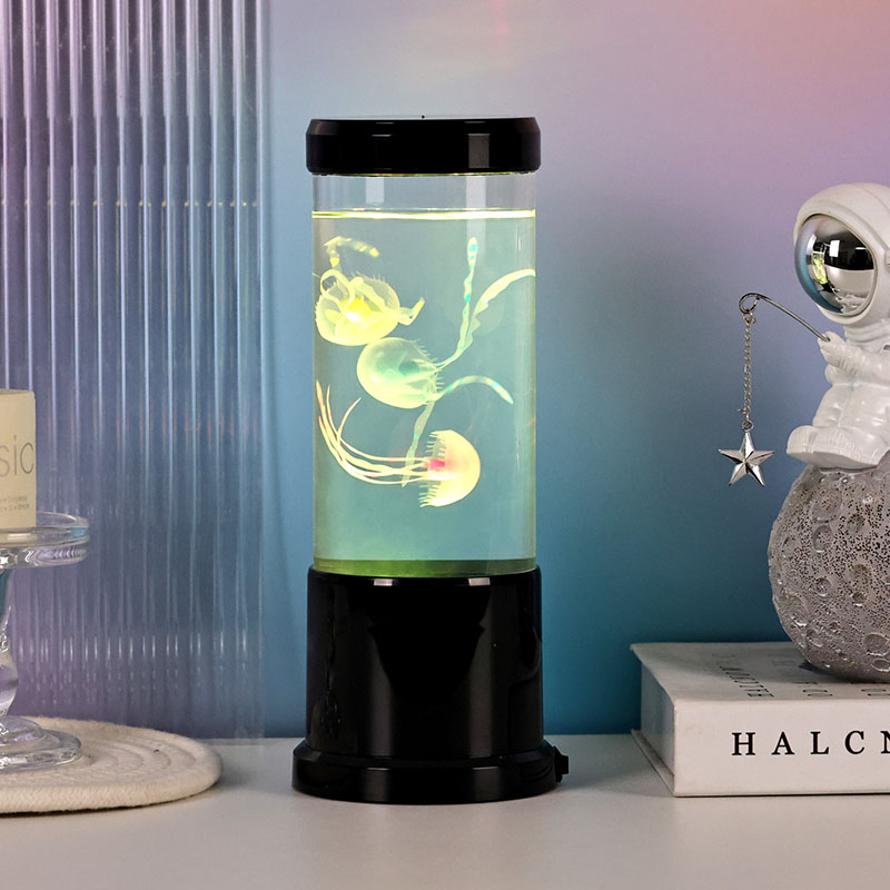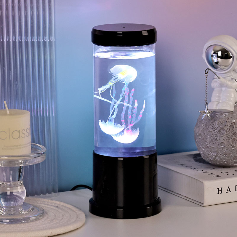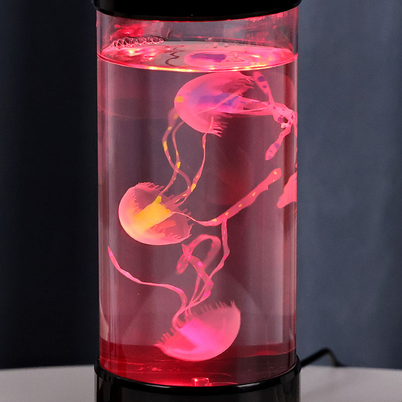 Η λάμπα διαθέτει ρεαλιστική μαύρη απόχρωση μέδουσες που επιπλέουν απαλά μέσα σε μια διαφανή κυλινδρική δεξαμενή, δημιουργώντας μια χαλαρωτική υποβρύχια ατμόσφαιρα που μετατρέπει κάθε δωμάτιο σε ένα γαλήνιο καταφύγιο στον ωκεανό.