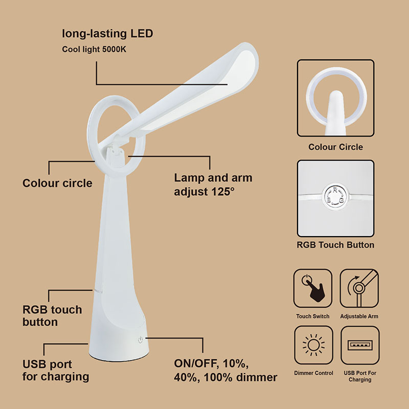 Διακοσμητικό φωτιστικό γραφείου led rgb μπορεί να μειώσει τη φωτεινότητα 3 στο πίσω μέρος του σώματος του προϊόντος. Η κεφαλή φωτός led μπορεί να ανοίξει 125° max.
