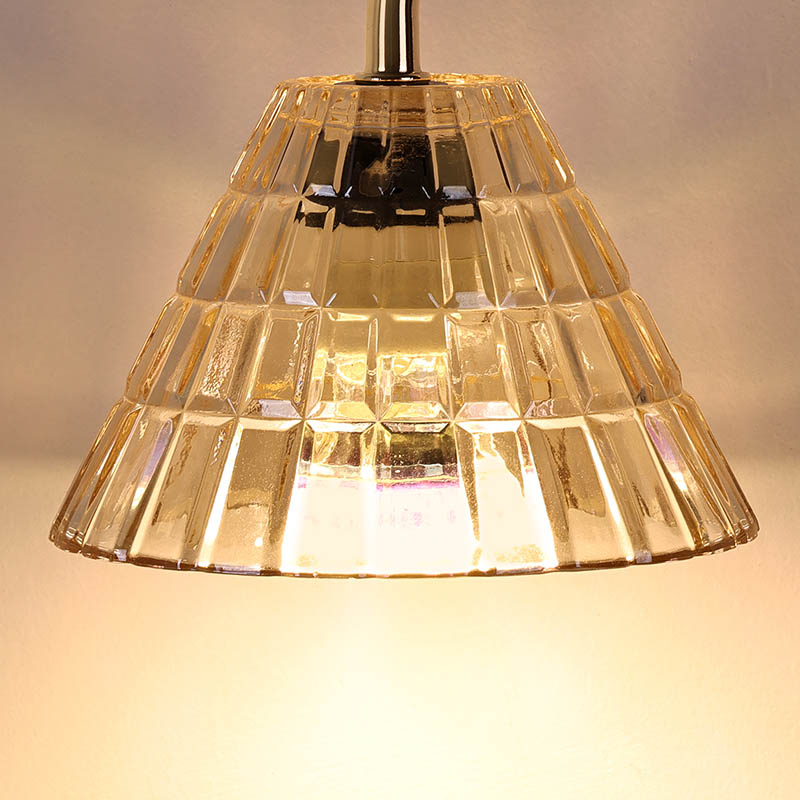 Το αμπαζούρ είναι κατασκευασμένο από διαφανές γυαλί (ακρυλικό), και το ζεστό χρωματιστό φως είναι πολύ κατάλληλο για διάβασμα. Το μεγαλύτερο σημείο πώλησης του επιτραπέζιου φωτιστικού γυάλινης σκιάς με ρύθμιση ύψους, εκτός από τη σχεδίασή του, είναι ο ρυθμιζόμενος καθ' ύψος λαμπτήρας με ένα περιστρεφόμενο κουμπί και το εύρος φωτισμού μπορεί επίσης να ρυθμιστεί ανάλογα με το ύψος.