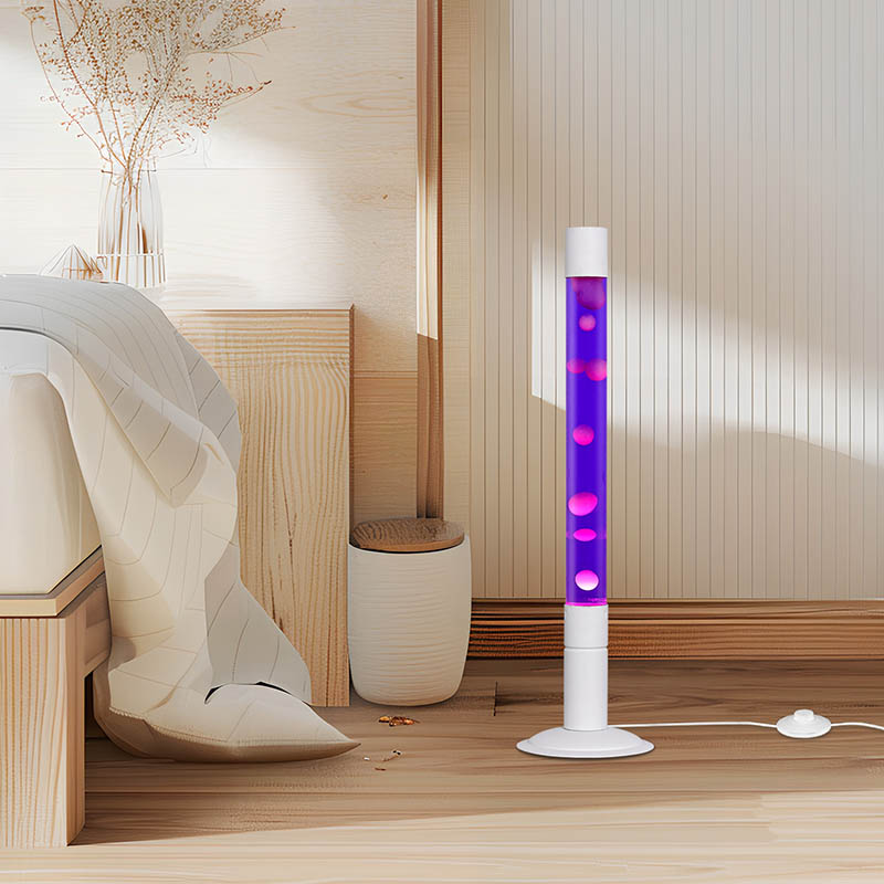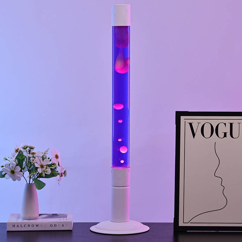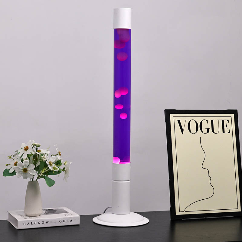 Η αληθινή καρδιά αυτού του λαμπτήρα έγκειται στο κεντρικό της χαρακτηριστικό: ένα μακρύ, διαφανές γυάλινο σωλήνα γεμάτο με μαγευτικό μοβ υγρό. Αυτό το υγρό, που θυμίζει μια γαλήνια λιμνοθάλασσα το σούρουπο, λάμπει κάτω από το φως, δημιουργώντας μια ηρεμιστική και αινιγματική ατμόσφαιρα. Μέσα σε αυτόν τον σωλήνα, μια σειρά από ροζ και μοβ μπάλες επιπλέουν χαριτωμένα, τις απαλές κινήσεις τους αιχμαλωτίζοντας τους θεατές και προσθέτοντας ένα δυναμικό στοιχείο στη στατική μορφή του λαμπτήρα.