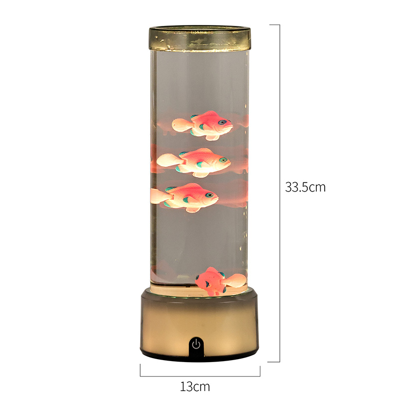 Διακόπτης επιλογής αφής και κολύμπι με μέδουσεςΦωτιστικό ψαριού Jellyfish με Διακοσμητικό Φωτιστικό Βάσης RGB, ένα νεοσχεδιασμένο παιδικό παιχνίδι θέασης με κυλινδρικό σχέδιο συγκράτησης νερού. Αφού γεμίσουμε με νερό, τοποθετούνται μέσα τρία ψαράκια. Η λάμπα ψαριών Jellyfish με βάση RGB μπορεί να κολυμπήσει πάνω-κάτω όταν περιστρέφεται ο μικρός κινητήρας στο κάτω μέρος. Ταυτόχρονα, η βάση έχει μετασχηματισμό χρώματος RGB. Το μεγαλύτερο χαρακτηριστικό αυτού του προϊόντος είναι ότι η βάση αλλάζει επίσης με τη μετατροπή του χρώματος. Ο εξολοκλήρου πλαστικός σχεδιασμός είναι πολύ ελαφρύς χωρίς συγκράτηση νερού, κάτι που είναι πολύ βολικό για τη μεταφορά. Η πηγή τροφοδοσίας της λάμπας ψαριών παρέχεται από USB τύπου C χαμηλής τάσης, η οποία είναι πολύ βολική