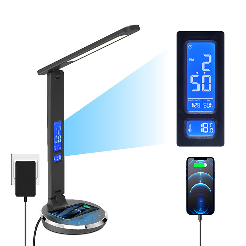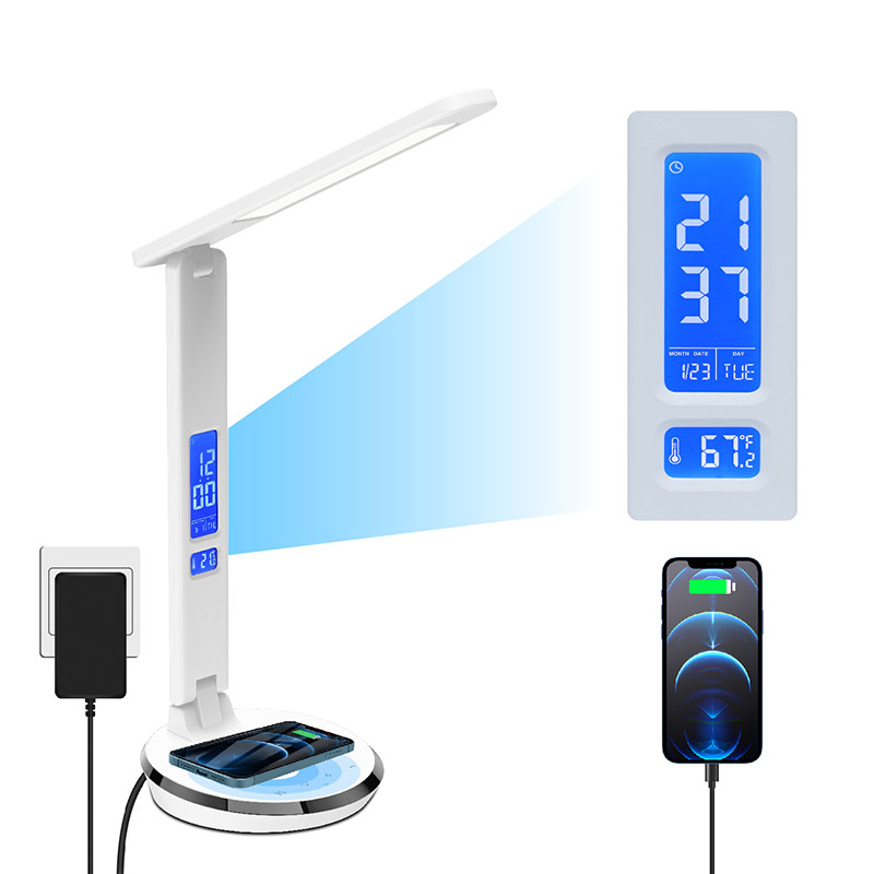 Υπάρχει οθόνη LCD με ένδειξη θερμοκρασίας, Ώρα, Ξυπνητήρι, Διαρκές ημερολόγιο με το κουμπί ελέγχου πίσω σώματος. Και υπάρχει θύρα φόρτισης usb πίσω από τη σκιά της λάμπας γραφείου.
