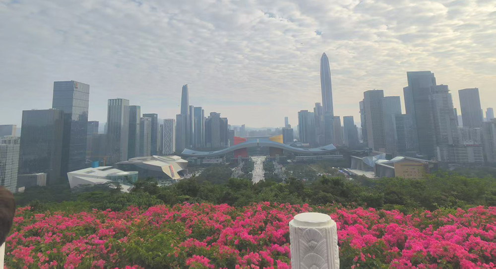 Μετά από 20 λεπτά αναρρίχησης, όλοι έφτασαν στην κορυφή! Στέκομαι μπροστά στο χάλκινο άγαλμα του συντρόφου Deng Xiaoping, με θέα την πολυσύχναστη πόλη Shenzhen, γεμίζω συναισθήματα.